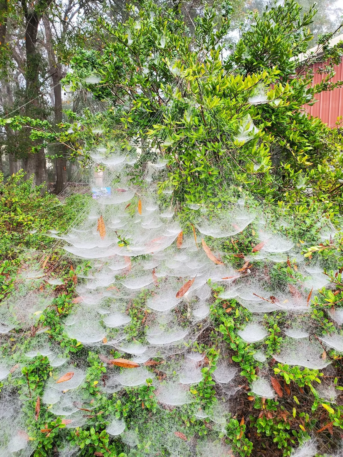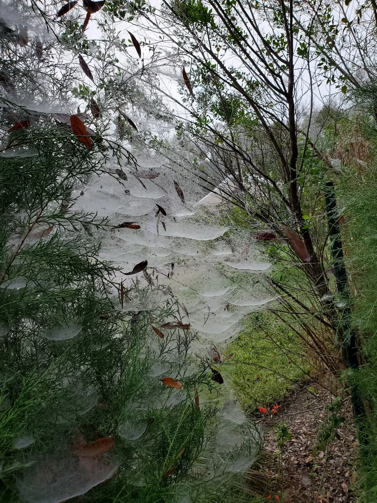 Spider webs on trees and other plants are fascinating. On foggy days humid air condenses onto silk strands.Water droplets catch and scatter light to reveal the intricacies of these webs. See photos here taken on a recent foggy morning at VISTA Gardens. For more info, check out this website: https://blogs.ifas.ufl.edu/wakullaco/2015/11/21/spider-webs-are-visible-on-foggy-mornings/